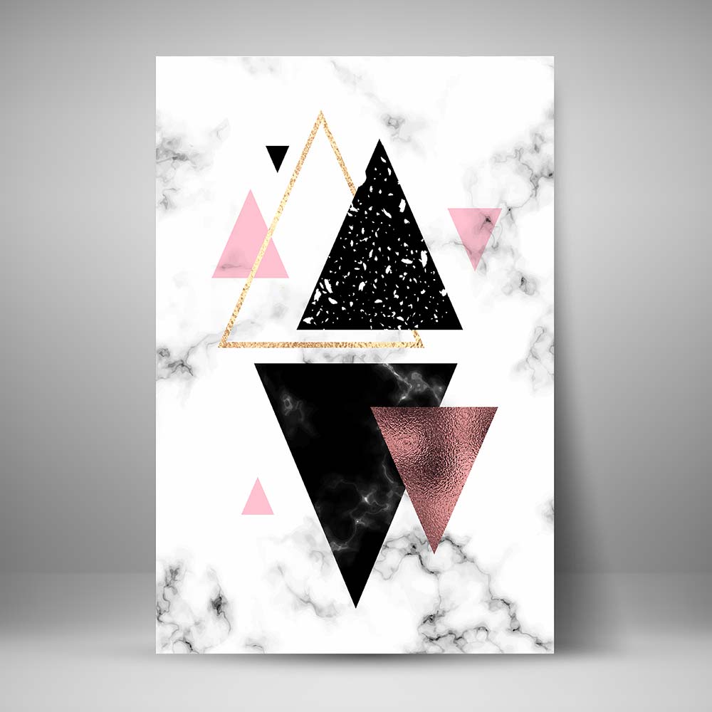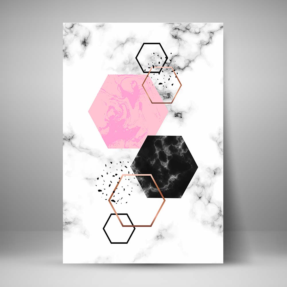 Juego de seis cuadros abstractos sobre Artes Geométricas en tonos negro, blanco y rosa.