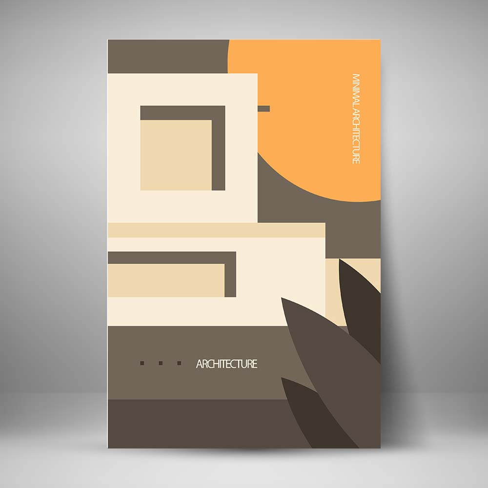 Juego de tres cuadros abstractos sobre Arquitectura moderna en tonos café y naranja.