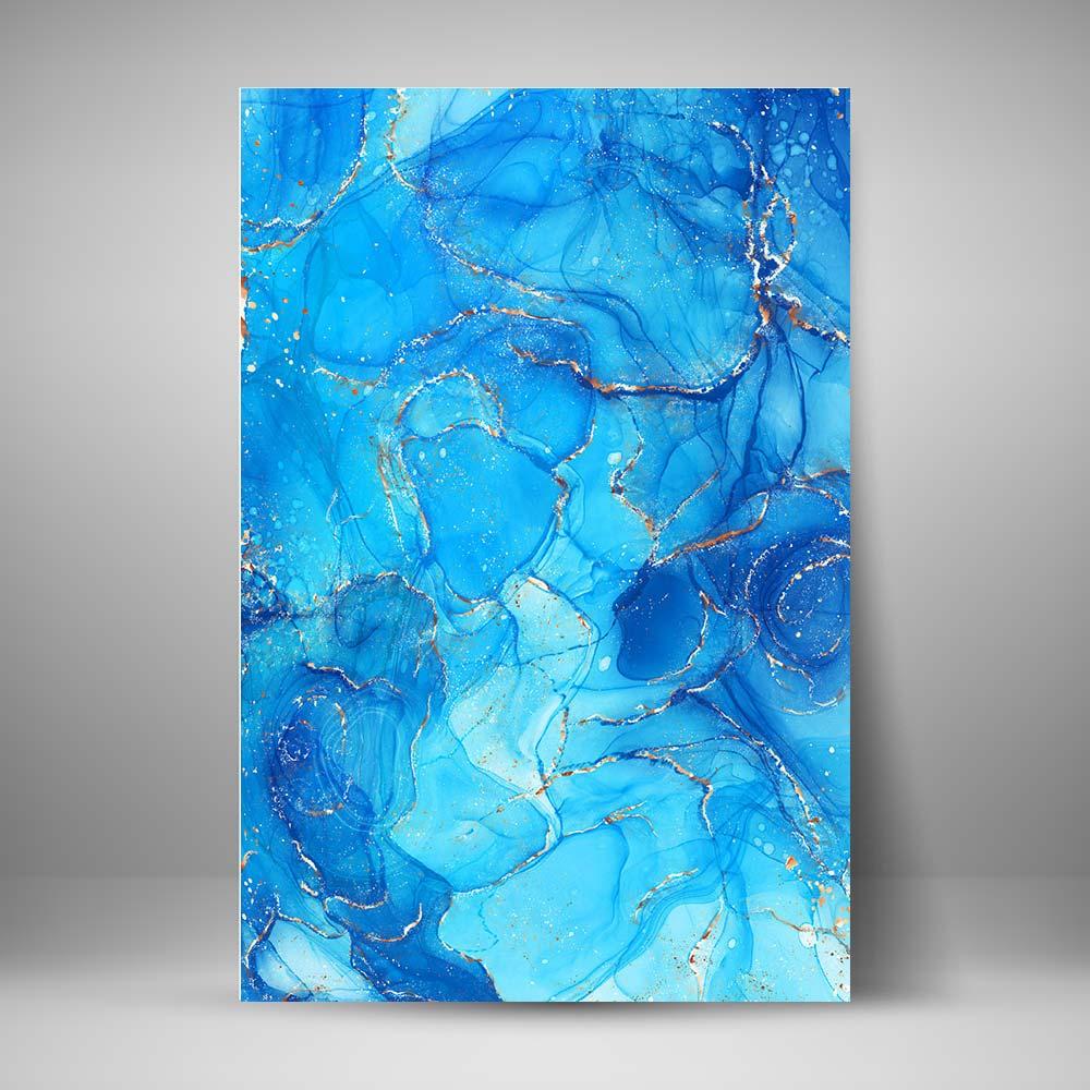Pintura abstracta creada con técnicas de tintas al alcohol en tonos azul y dorado.